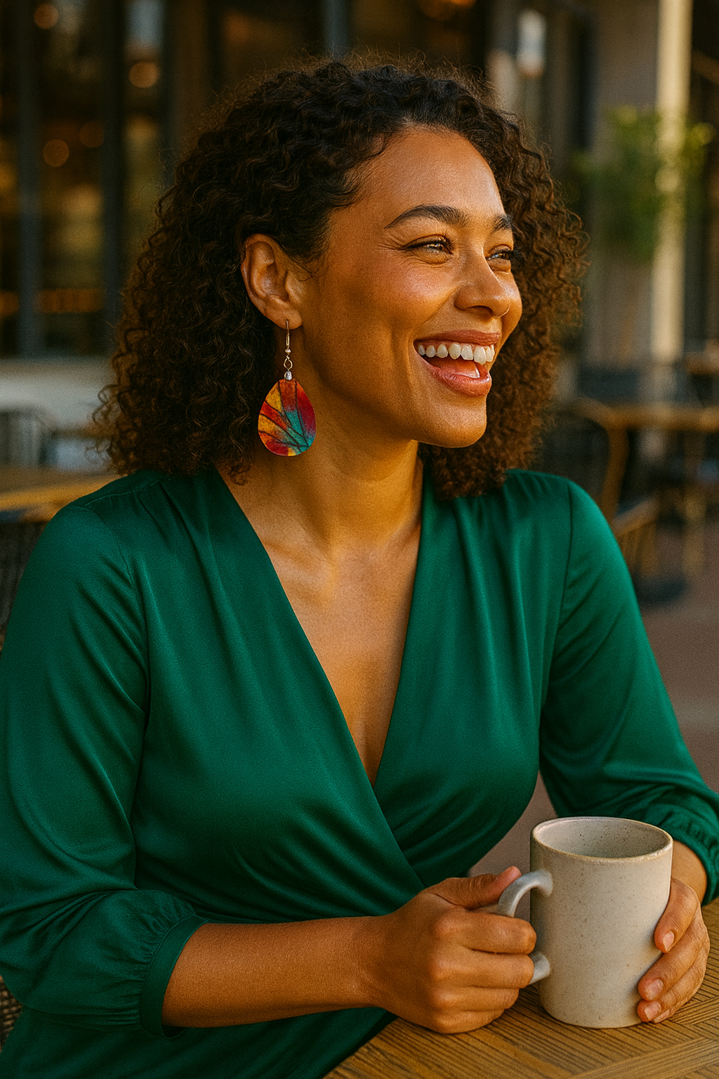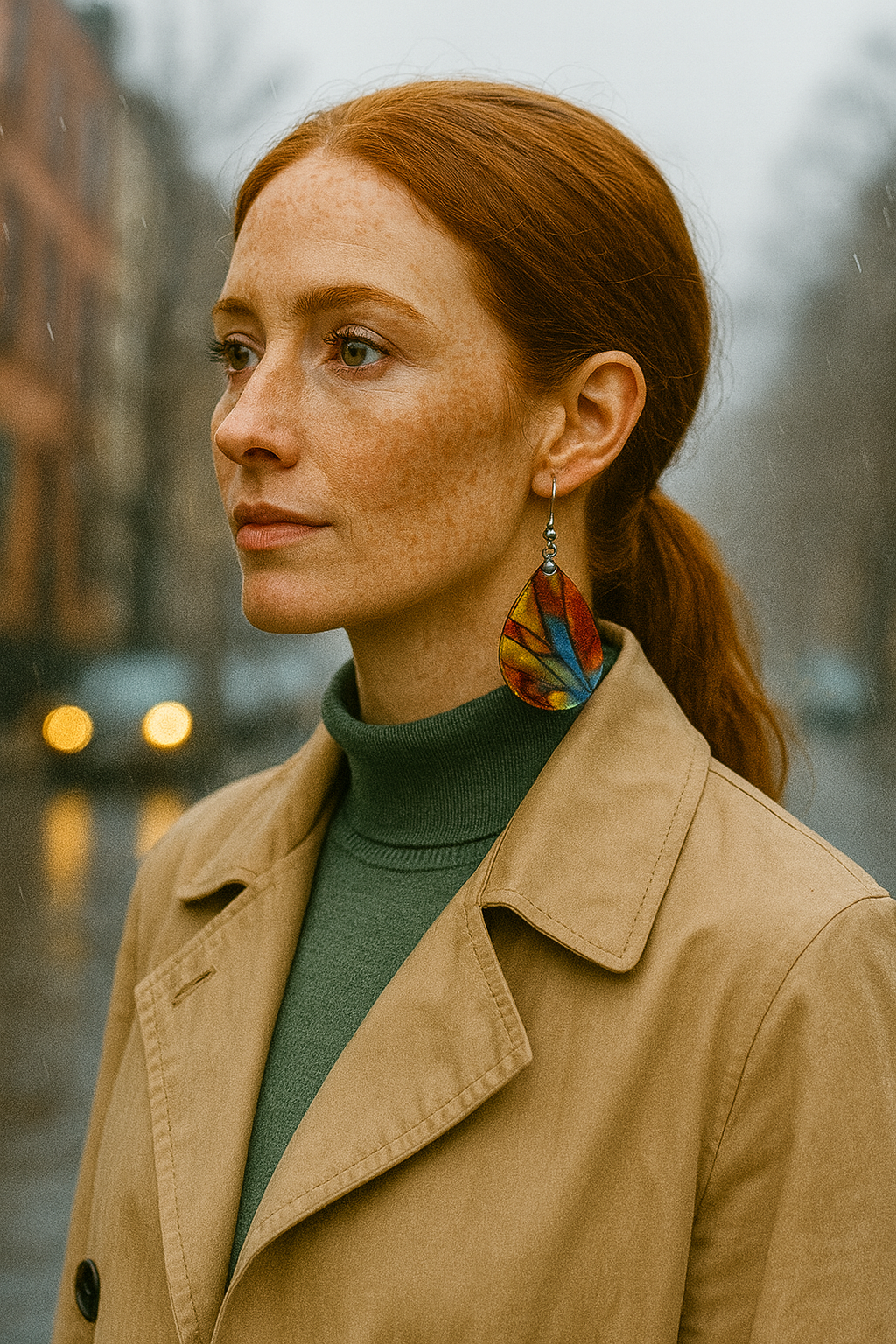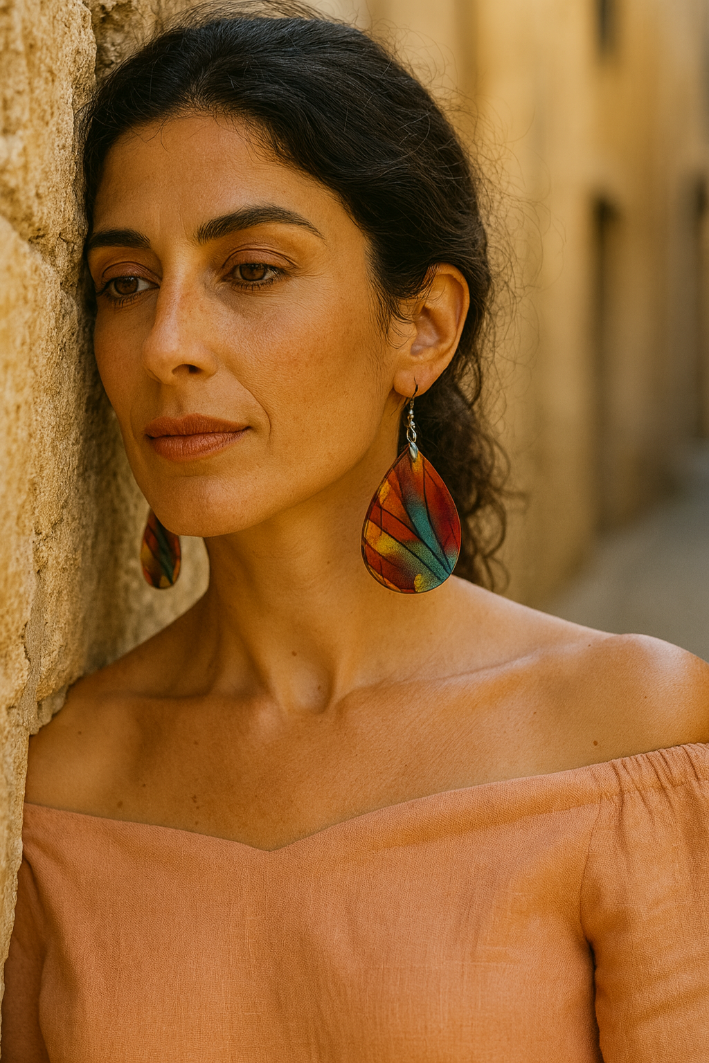 Add a bold splash of color to your look with these vibrant teardrop earrings. Handcrafted from lightweight acrylic, each pair features a kaleidoscope of jewel-toned hues—fiery reds, golden ambers, ocean blues, and lush greens—arranged in an artistic, wing-inspired pattern.