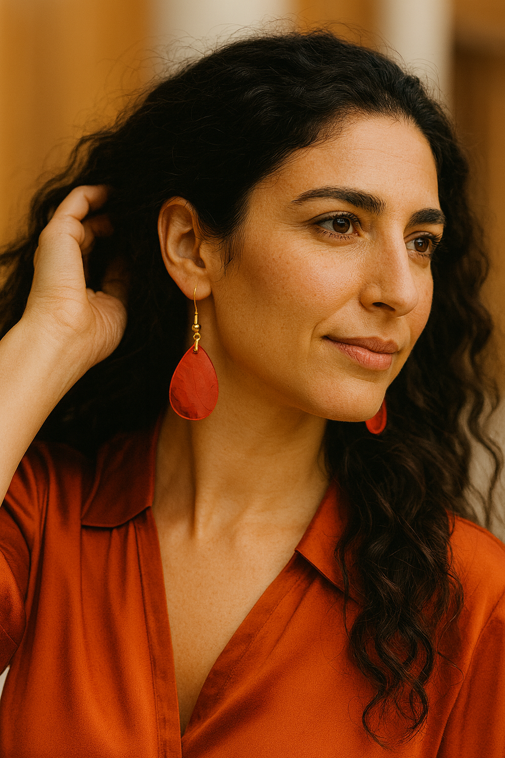 Add a bold pop of color to your look with these stunning handcrafted teardrop earrings. Made from lightweight acrylic in a rich marbled red hue, each piece features subtle swirls that catch the light beautifully for a unique, artful finish. The golden hook accents provide a touch of elegance while ensuring comfortable all-day wear.
